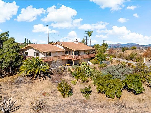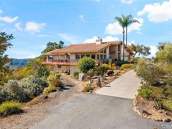 Spectacular VIEWS from all around offered through this exceptional single story estate situated in the hills of Valley Center. Enjoy the peace and quiet this gem has to offer including approx. 2.2 acres of land, stunning cedar vaulted ceilings, 3/4 wrap around balcony, covered patio off of the kitchen and family rooms, double ovens and wood burning fireplace. The list goes on and on! Separate inside laundry room for added convenience. 3 BR/2 BA and approx. 1,943 sq. ft. living space. There is also an additional approx. 700 sq. ft. unfinished and usable basement. Plenty of shade, nut and fruit bearing trees, too. Bring your toys, RV or boat. This property is RV hookup compatible. 2-car garage. Plenty of storage space. Extremely private setting while still centrally located and just minutes from I-15. Ideal for commuters who wish to experience country living while being afforded the convenience of working in the city. Welcome home!