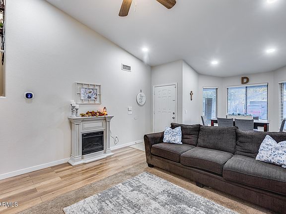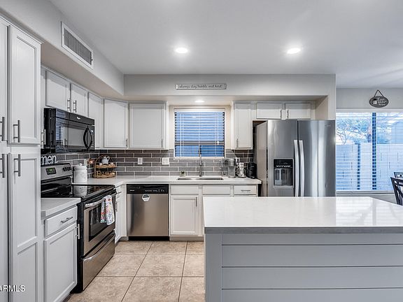 Move-in ready home with fresh exterior paint, modern interior upgrades and an ideal location! Discover a beautiful home nestled in a prime location near Westgate and offering unbeatable access to the entire Valley with close proximity to I-10, Loop 101, and Loop 303. This beautiful home boasts a renovated kitchen featuring stunning new countertops, stylish backsplash, tile flooring and modern finishes. New laminate flooring and baseboards throughout! The home showcases upgraded recessed lighting and chic fixtures for a contemporary touch. A 4-year-old AC unit and a brand-new sliding door ensure comfort and efficiency. Step outside to a landscaped backyard complete with a covered patio, firepit, grass and rocks. Situated directly across from the community playground!
