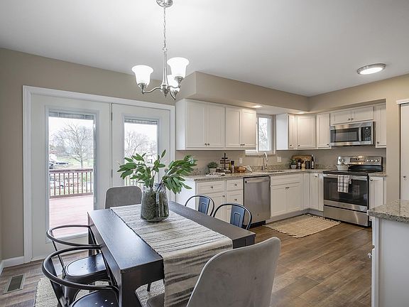 Spectacular, renovated Split Entry with 5 Beds, 2.5 Baths, walkout Lower Level and fenced double lot! Fox Schools! Main Floor finds a generous floorplan filled with natural light and neutral paint throughout. Living Room features large double windows; Breakfast Room with access to the large deck; Kitchen includes custom white cabinetry, stainless appliances, granite countertops and pantry. Master Bedroom includes an en suite Bath with shower and larger reach-in closets. Four additional generously sized Bedrooms and one full Bath completes the Main Floor. Finished walkout Lower Level offers an incredible Family Room and half Bath, as well as laundry, storage, garage and access to the patio and yard. NEW (2022-2023) - Roof, HVAC, LVP Flooring, Carpet, Interior Doors, Electric, Kitchen and Bathrooms, Garage Openers, Fresh Paint, Hardware, Appliances and more! Highlights: double fenced lot, side entry oversized garage, shed and extra parking.