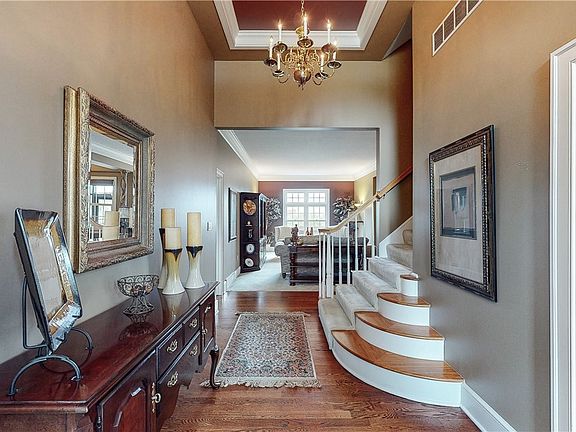 Entertain in style with the impressive foyer, formal living and dining rooms, each offering panoramic golf course water views. A private office off the entry provides a quiet workspace. The open-concept family room features 10-foot ceilings, a cozy gas fireplace, and a gourmet chef's kitchen complete with granite countertops, a pantry, a dining area, and an updated half bathroom. Step outside to the screened sun porch and expansive upper-level deck for serene outdoor enjoyment.