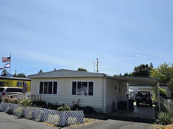 River Haven Mobile Park is tucked in at the corner of Dowell rd and Leonard rd. The owner just had all the windows replaced with white vinyl frames. It offers a large living room with attached dining area, kitchen has newer wall oven and counter cooktop. There's a side door to the carport, primary with bathroom, a second bedroom and the hall bathroom with tub only. This home is in good shape. Outside with 3 outbuildings and a raised strawberry garden, raspberries and thornless blackberries. The front entrance offers a nice deck for enjoying the summer warm evenings. There is a community building and a laundry building for use. Water, Sewer and Trach are included in the rent. There is a community park which has a pickleball and dog park. Asante Hospital, Urgent care, Banks, and shopping are just a few miles away.