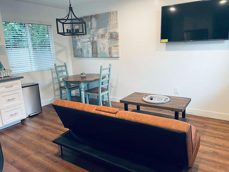 Furnished New Central A/C Detached Guest House. 1 Bed and 1 Bathroom plus Living Area and Kitchen. Private entrance with Separate Patio. Bedroom contains a Queen Bed, Night Stands, and Sofa. Lots of Closet Space. The Living Area has a Cafe Table/Chairs, and Couch. Use a Streaming Device of your choice with the TV set. The Kitchen includes a Dinnerware, Sink, Fridge, Microwave, new stove and a Combo Washer/Dryer. Owner pays utilities, internet cable. Lease term is flexible.