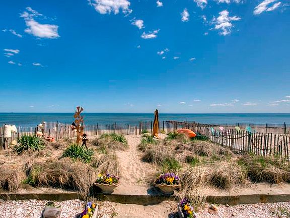 On the beach! 25 feet of direct waterfront just steps from your door. Panoramic water views of Long Island Sound thru the walls of glass in the living room and balcony off Master Bedroom. BBQ on the beachside patio and watch the sunsets or enjoy the sunrise from the Master Bedroom. Renovated kitchen w/granite countertops and SS appliances. Master w/walk-in closet, vaulted ceiling,& sliders to beach side balcony. Two additional bedrooms w/vaulted ceilings. Attic storage. Cedar closets on the second and lower levels. Attached garage w/interior access to mud rm. 3 additional parking spaces. Ample storage off LL staircase and back of garage. Owned by the same family for three generations who rebuilt this home in 1985. Also, see listing 99092742.