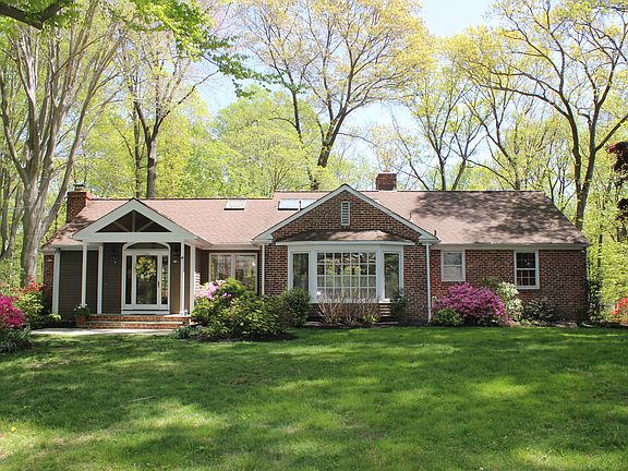 This beautiful custom home sits on 1.3 acres in the sought after Hunt Tract. Remodeled and expanded in 1990, the new foyer opens to pegged oak hardwood floors that are featured throughout much of the home. The living room's brick wood burning fireplace, cathedral ceilings and large picture window make it a great room to double as a family room if desired. The home's second brick wood burning fireplace in the kitchen along with the vaulted ceilings, skylights and open design make the kitchen the heart of this home, built to entertain. Pocket doors open the kitchen to the dining room and its beautiful bay window. The main floor also features the master bedroom, two full baths and two additional bedrooms. The lower level features the fourth bedroom with an ensuite bath--perfect for an in-law suite. The lower level also features a large family room that leads to an outside bluestone patio.
