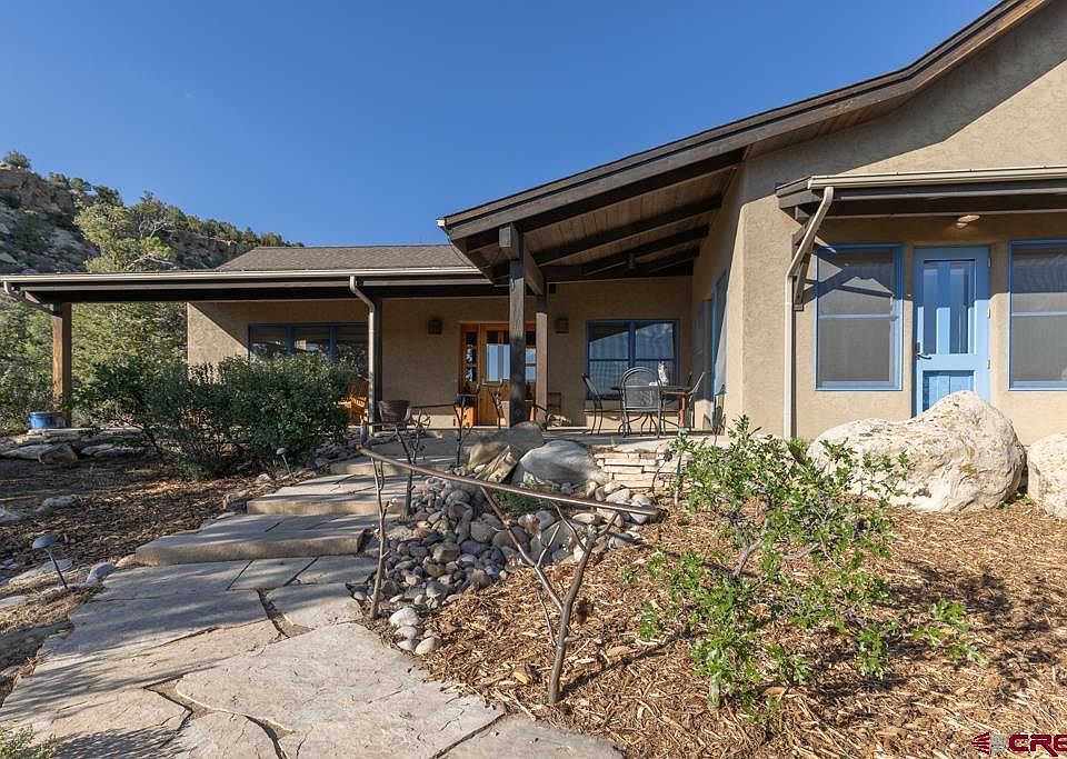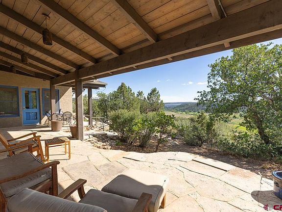 Welcome to 1241 Thoroughbred Road, a stunningly preserved ranch in southwest Colorado. Located in the Florida River Ranch just south of Durango, this 35-acre property features two beautiful homes discretely nestled in the private hillside. The luxurious main home and charming guest house both showcase meticulous attention to detail, high end finishes and the implementation of energy efficient construction methodologies and a PV Solar system that keeps wintertime heating affordable and summertime cooling just as efficient. The main house is large enough to house most families and the guest house can house your guest, caretakers, visitors or serve as a tremendous rental income option for long term tenants or extended stay traveling nurses. See Covenants for details. Situated upon a rim lot overlooking the Florida River Valley, the homes provide wide spanning views of the valley and river below and the cliffs behind, surrounded by unique boulders that create a quintessential Southwest Colorado dreamscape. The homes blend seamlessly with their surroundings, offering unparalleled privacy. The current owners purchased this beautiful home in November 2016, drawn by its custom craftsmanship and fine finishes and high quality construction. The main house features a mantel made from a log on the property, large custom doors, intricate ironwork on the fireplace, walkways, and signage. The kitchen is a chef's dream, equipped with an imported Aga stove, custom tiles with a water oak pattern matching the ironwork, a separate pantry with an extra freezer, and custom light fixtures. The natural brick, wood, and tile flooring throughout the house adds to its charm. Every room on the main floor has access to outdoor patios and plenty of natural light, enhancing the indoor-outdoor living experience. The living room, with its vaulted ceilings, is centered around an imported Rumford fireplace, renowned for its efficient heat and ambiance. The built-in indoor/outdoor sound system makes it perfect for entertaining. The master bedroom is bathed in natural light from numerous windows, offering an inviting outdoor feel. The master bath includes a soaking tub, separate shower, and an expansive walk-in closet. There is a large hobby room (or 3rd main level bedroom) with a private patio and an outdoor hot tub. The main house also has two more bedrooms and two full bathrooms, providing ample space for family and guests. A large 2-car garage is attached, and each room in the home offers outdoor access to enjoy the renowned Colorado nature. Solar panels on the southern-facing roof and central air conditioning in both homes ensure energy efficiency and comfort. The 1,000+ sq ft guest home, complete with a heated 2-car garage/shop and adjoining carport, adds tremendous function. This space features a brick walking path, brick patio, two bedrooms, two bathrooms, a full kitchen with granite countertops, and an imported Aga range/oven. Like the main home, it also includes a built-in indoor/outdoor sound system. The current owners often enjoyed sunsets from the hot tub, sunsets from the swing along the rim and hikes on the ridges behind the house, where they viewed wildlife, including elk, deer, jackrabbits, foxes, coyotes, bears, bobcats, and a variety of birds. Located just south of Durango, Colorado, the property is conveniently close to world-class skiing at Purgatory Ski Resort (43 miles) and Hesperus Ski Resort (27 miles). Nearby, you’ll find mountain biking and hiking trails, and Navajo Reservoir is just 38 miles away for wakeboarding, fishing, and water skiing. Despite its privacy, the property is only 20 minutes from town and 35 minutes from Farmington, offering the perfect balance of seclusion and accessibility.