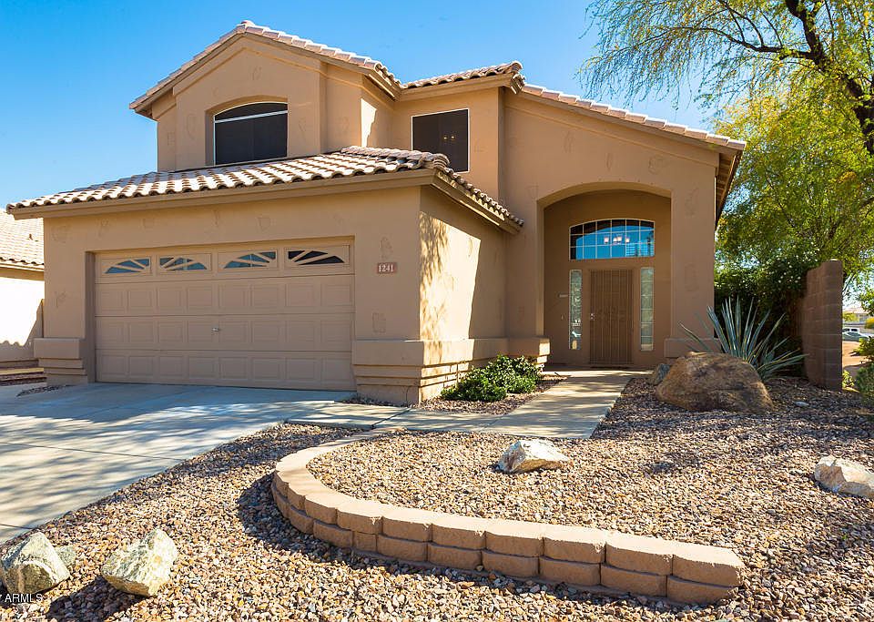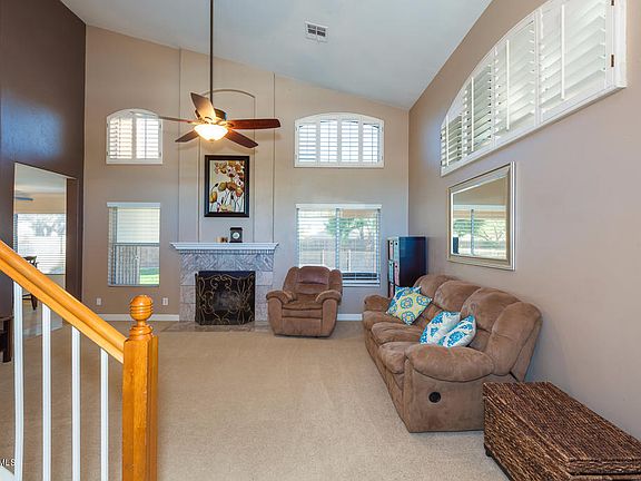 WOW! A terrific 3 bdrm home with a fenced Pebbletech pool and backs to a park and has a small HOA wash to the west! No neighbors behind and extra space to the west! Great Room floor plan with plantation shutters, soaring cathedral ceilings and fireplace! Large eat-in kitchen with breakfast bar, stainless steel appliances and lots of cabinets! Security doors front and back! Kitchen overlooks grass backyard & pool! 2 car garage with insulated garage door, shelves & cabinets! Travertine tile floors and carpet; hall bath has jets! Shows great, very clean, neutral colors, ready to move into! Pool light in ''as is'' condition.