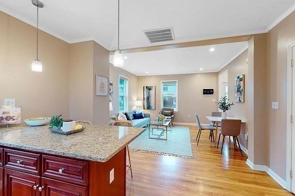 This fantastic Newton Highlands townhouse is just few minutes walk to Green Line "T" stop. Converted and fully renovated in 2009. Many updates like two 2025 bathrooms, 2022 front porch, 2021 Tankless Gas hot water system, and 2020 AC compressor. The main level has an open floor plan with a spacious granite kitchen, stainless steel appliances, and a granite island. Hardwood floors and recessed lighting. Modern finished basement with built-in shelf is a perfect space for an office, family room.. the 2nd floor has two good size bedrooms with one full bath. the 3rd floor is a perfect place for a home office/playroom/Gym. Paved driveway for 3 car parking. Convenient to RT9/128/Mass Pike. Close to restaurants, shopping and park. One of the best school systems!