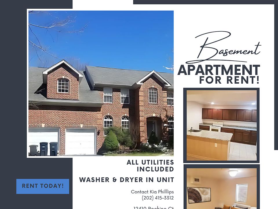 Spacious 1 Bedroom, 1 Bathroom Basement Apartment in Glenn Dale. Amenities included: Kitchen, Dishwasher, Laundry. Separate Entrance. Utilities included: electricity, heat, gas, air conditioning and water. No pets. No smoking. Date Available: Feb 1, 2025. $1,700/month rent. $1,700 security deposit required. Not furnished. Minimum 12 month lease. Utilities included
