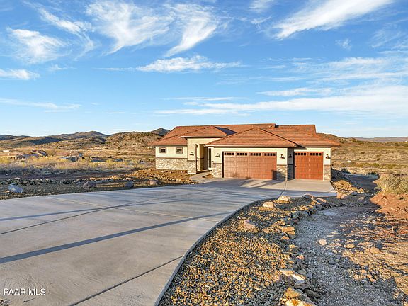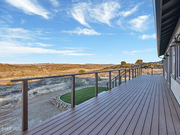 Experience the scenic overlook from this hilltop beauty in the Daybreak at Bensch Ranch gated community. Upon entry feel welcomed by an open floor plan including a spacious kitchen, family room and dining room. Enjoy panoramic views of the surrounding mountains from all rooms and the east-facing deck that spans the width of the home. This home is stylized with gorgeous finishing touches, natural stone countertops and natural finishes throughout. The house features two fireplaces: one in the family room, and another in the custom master bath primed with a luxury tub and spacious walk-in shower. Residents enjoy access to a private 4,000 sq ft clubhouse, paved walking path, community pool, and dog park. Located between Prescott and Phoenix you can enjoy outdoor amenities,
