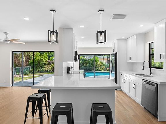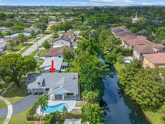 Looking for the perfect blend of luxury and comfort? This 3 bed, 2 bath waterfront home with a garage and separate office space is the one! Enjoy stunning views of the pool and dock from the newly redone pool deck. The interior boasts high volume ceilings, an open concept kitchen and living area, and wood look flooring. The primary bedroom is a serene retreat with a walk-in closet, private bathroom, and separate vanity/make-up area. The backyard is fully fenced for privacy and features a covered patio and pool. Located on a quiet cul-de-sac and just minutes from American Heritage Academy. This home has it all! No HOA! Property has partial hurricane windows and a power shutter for the pool sliding door.