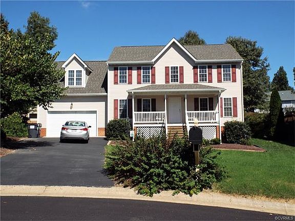 Beautiful 2-story home in Chester! This property features 4 bedrooms, 2.5 baths, 2,008 square feet, large cozy family room with propane gas fireplace, formal dining room with lovely chandelier, large eat-in kitchen with charming breakfast nook, vinyl floor, and bar. HUGE master bedroom with sitting area, walk-in closet, master bath with jetted tub, separate shower, and double vanity. 4th bedroom is also HUGE and would be a fantastic play room or rec room! 2-zoned central electric heat and air updated in 2014, pull-down attic for storage, 2-car attached garage, front country porch, screened-in rear porch, NEW ROOF and gutters as of this year, hot water heater replaced in 2015, lovely landscaping, hardwood floors on the 1st floor, close to Fort Lee, schools, and interstates but tucked into a quiet cul-de-sac. Come see this amazing home!