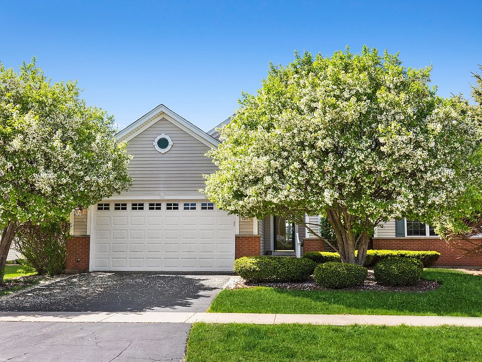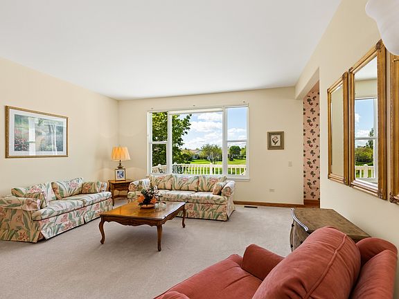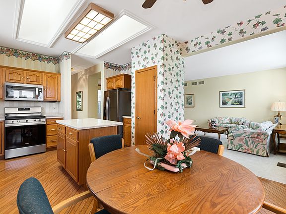 One of the most popular model of homes...the Mackinac A and located in one of the most coveted areas of Del Webb Sun City...ATWOOD LANDINGS and just 3 houses down from the golf cart path. Upon entering this home, you immediately notice the 9' CEILINGS and the VIEW OF THE 14TH TEE out the great room window to the rear yard! To the left of the spacious foyer is a large laundry room with sink, cabinets and plenty of storage with a door leading to the oversized 2.5 car garage that even has room for a golf cart.To the right is the formal dining room with gorgeous views out the front window. The large kitchen features 2 large skylights, STAINLESS STEEL APPLIANCES, a brand NEW RANGE AND MICROWAVE, a large eating area and gorgeous HARDWOOD FLOORS. Beyond the kitchen is the 4 SEASON HEATED SUNROOM with sliding glass doors leading to the deck. Imagine entertaining on the deck with views of the 14th tee of the golf course with greenery as far as the eyes can see! The master bedroom and bathroom are located on the opposite side of the home from the 2nd bedroom and full bathroom which also features a skylight bringing tons of natural light into the space. Down the stairs you enter the WALK OUT BASEMENT with oversized recreation space, 8'6" ceilings, a 3rd bedroom and a full bathroom. The crawl space and the mechanical room both provide substantial storage space. This property is in a spectacular location, has been professionally landscaped and features an underground sprinkler system. All carpet on the main floor is new. Roof was replaced in summer of 2018.