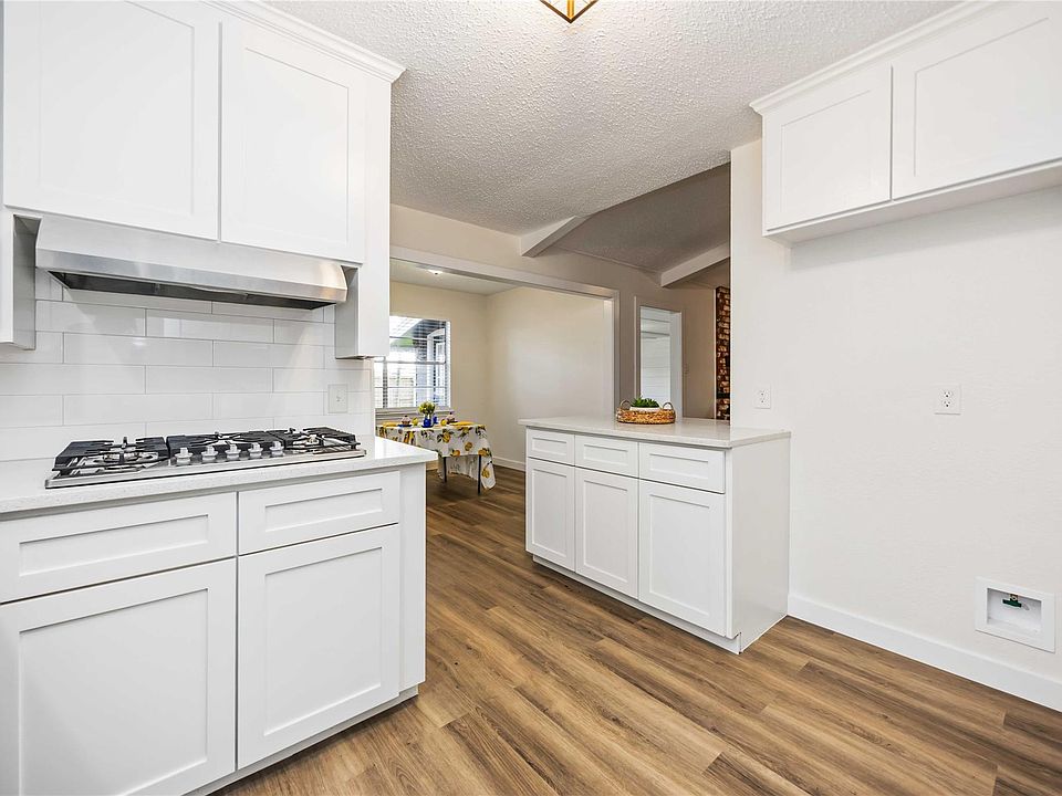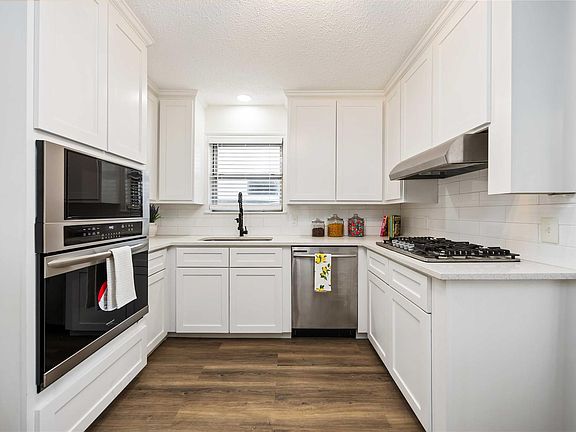 Nestled in the quiet charm of Triple Bar Estates, this beautifully updated single-story brick home offers not just comfort, but connection. Imagine mornings filled with sunlight streaming through large windows, casting a warm glow across wood-style flooring & crisp white walls. Vaulted ceilings with exposed beams add architectural character, while the rustic brick fireplace anchors t/living room w/a cozy touch. The heart of the home, a bright and modern kitchen, features sleek white cabinetry, stainless steel appliances, & a gas cooktop, all seamlessly flowing into open-concept living spaces. Whether it's casual breakfasts at the bar or festive dinners in the formal dining room, there’s room to create lifelong memories. The bathrooms offer timeless design with subway tile, black fixtures, & abundant storage. Step outside into your private backyard—lush green grass, mature shade trees, & a fenced yard invite laughter-filled nights. It's more than a house—it’s where your story continues.