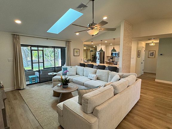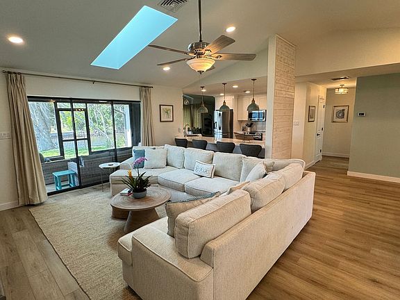 The incredible open water views will take your breath away from this completely renovated waterfront home. Located on a quiet tree lined cul-de-sac. This home offers 3 bedrooms with 2 1/2 bathrooms with tile throughout. This home has it all, spacious and bright living and dining room, gourmet kitchen with breakfast bar, family room, and gorgeous views of the waterways. The master bedroom has a walk-in closet, ensuite bathroom, and direct lanai access. The master bathroom has dual sinks, a walk-in shower, a linen closet and a skylight. The 2 guest bedrooms both have walk in closets for ample storage. The guest bathroom has a skylight, which allows lots of natural light. The split floor plan offers privacy for all. The large screen lanai boasts killer views and a brand-new hot tub. The shaded back yard has plenty of things to do, relax in the hammock, enjoy the fire pit, drop a line off the dock, or just enjoy the views. Only minutes to world class beaches. Convenient shopping, restaurants, and entertainment. Easy access to I-75, Sarasota Airport, Tampa International Airport, and Tampa/St. Petersburg.