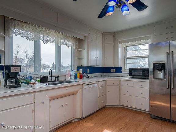 Welcome to the Town of New England. This home is located in a great location across the street from the school! The school is currently under going a large addition. The home has newer appliances and a double garage. Large corner lot with a shared well for your yard and garden.