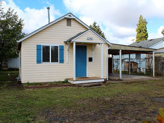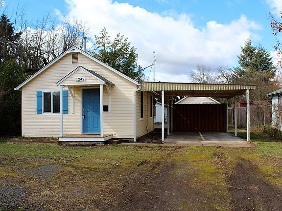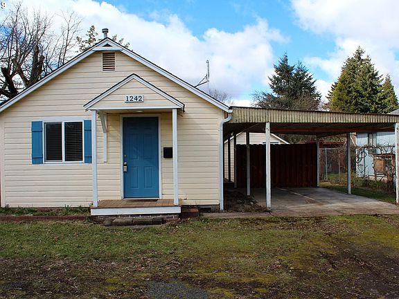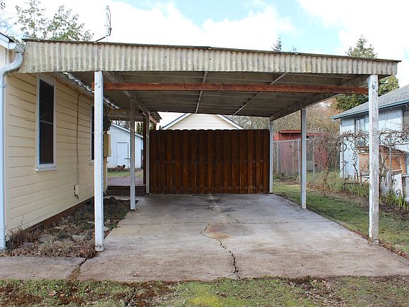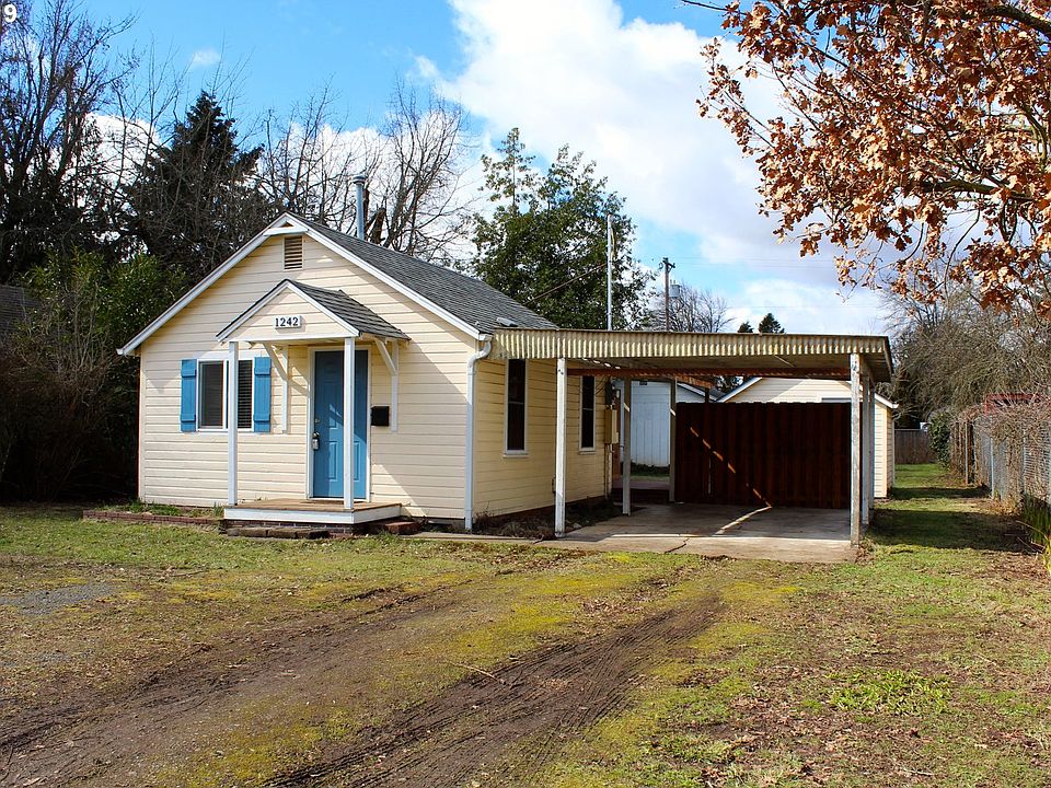 Bungalow style home located on a large lot with ally access, covered carport, 10 X 8 foot tool shed, 20 x 18 shop, new roofs in 2013 (all structures), interior includes laminate flooring, living room open to kitchen with butcher block eating bar/counter, washer and dryer included, covered deck off the bedroom, convenient location.