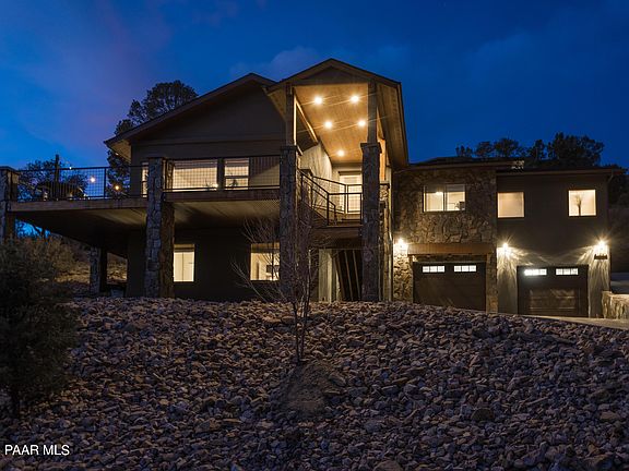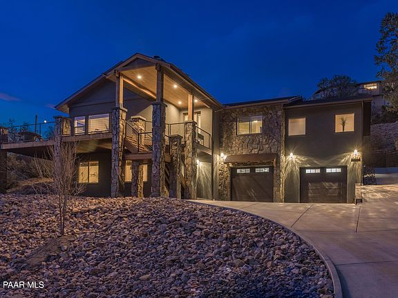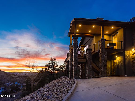 Located in the highly desirable subdivision of Quail Hollow and just minutes from all that historic downtown Prescott has to offer, this property boasts outstanding curb appeal, a wide-open great room design concept, a private quiet location with abundant mature trees & main level with sweeping panoramic views of the Bradshaw mountain range, Thumb Butte & the surrounding vistas. The home features numerous modern construction elements including huge stack stone columns, Omni block construction that provides great energy efficiency and quiet living, corrugated metal accents, metal fencing, exposed beams, T & G lid and recessed LED lighting. The main/upper level interior includes vaulted ceilings, a floor to ceiling stone fireplace with a custom mantle that is gas or wood burning, CONTINUED..