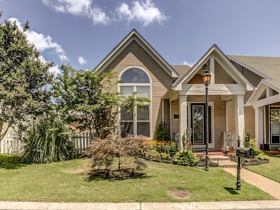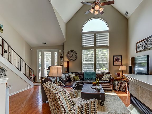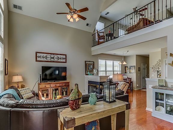 Fantastic home in the heart of Harbor Town~Walk in to beautiful hdwd floors, vaulted ceilings w/ wrought iron hand rails & balcony + a loft~Rare in this area! Ceiling to floor windows let in tons of natural light & provide a great view of the cove-like setting~Open kit for entertaining, SS appliances, breakfast bar~Master down w/ en-suite bath. Sep shower, double vanity, his/hers closets~Large loft upstairs w/ 2 more bdrms & bath~Charming front porch & back patio for morning coffee