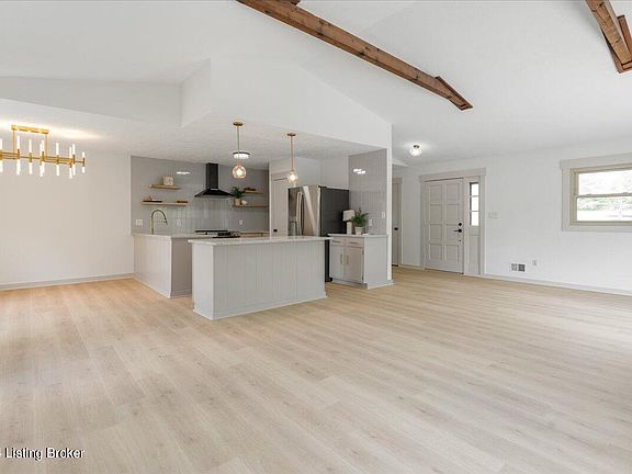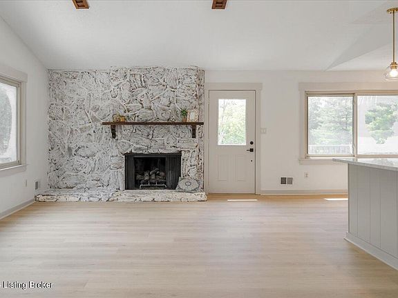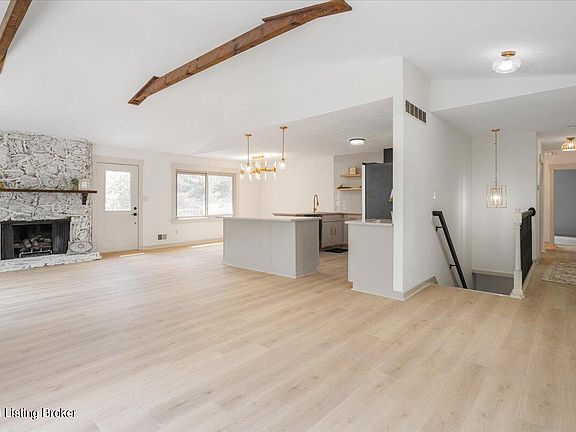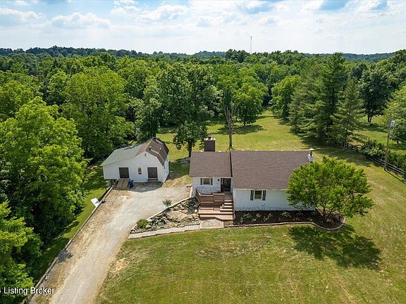 Priced below recent appraisal! 7.96 ACRES in award winning Oldham County school district! This 5 bedroom, 2.5 bath walk out Ranch is completely updated and ready for you to make it your own private paradise. With a harmonious blend of scenic nature and stylish design, everything is new and modern. All new 7-inch wood plank flooring throughout, brand new roof, renovated kitchen and bathrooms, all new lighting, and more! Enter into an impressive open layout, beginning with a huge great room with a wall of windows, offering tons of natural light and an incredible view. A wood-burning fireplace with stone surround gives the space a nod to its rustic roots. Perfect for entertaining guests, your beautiful gourmet kitchen has all new stainless appliances and exquisi quartzite countertops. Gorgeous tilework and all new golden fixtures elevate the design and make your meal prep a thrilling experience. A breakfast bar and spacious dining area allow for plenty of seating options while dining. From here, you also have access to the back deck which extends the length of the home and provides a relaxing place to enjoy fresh air and scenery. Down the hall, you will find your primary bedroom with a large walk-in closet and an ensuite bath behind a sliding barn door. Your updated bathroom features a walk-in shower, luxurious soaking tub and stunning fixtures and lighting. Three additional bedrooms and a full bath complete the main level. The finished walkout lower level is the perfect place for lounging and entertaining. With new carpeting and fresh paint, you have a large family room, your fifth bedroom, a bonus room, half bath, laundry room, and plenty of storage space. From here, you also have access to your attached, 2-car garage. Sliding glass doors give you access to a back patio and access to your immense backyard. In addition to the main house, you have an impressive outbuilding with its very own basement. Your picturesque lot has an abundance of greenspace and mature tree-lines that give your home privacy. Although you may never want to leave home, you are conveniently minutes from I-71 and the retail, dining, and entertainment throughout LaGrange. Schedule a private tour of this stunning home today!
