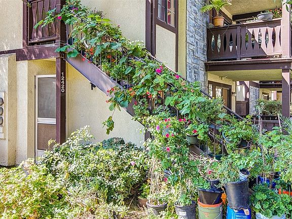 Nestled between river rock streams, waterfalls, and manicured lush landscape offering a serene setting with duck ponds, wooden bridges and boasts 2 resort style swimming pools/spa in the illustrious gated community of Les Jardins. This roomy 1 bedroom 1 bath lower level end unit features open and airy living room with tons of natural light, recessed lighting and floors overlaid in light laminate style wood that carries into the hall and bedroom, separate dining area that offers sliders to the covered patio. Galley style kitchen with white cabinets, grey granite looking countertop, gas stainless stove, dual stainless sinks and neutral ceramic tiled floors. Bedroom features a walk -in closet, 2 panel doors and flows seamlessly. Bathroom has been remodeled with a porcelain framed shower/tub with glass enclosure, stylishly lined in porcelain floors, granite counters and maple style cabinets. Home boasts full size laundry inside and a detached 2 car oversized garage. Les Jardins HOA is only $395 a month and includes your water and trash. Les Jardins is conveniently located close to Restaurants, 22, 5 and 57 freeways, shopping, within walking distance to High School and Intermediate School and nearby to River View Golf course and so much more. VA approved, NOT FHA approved.