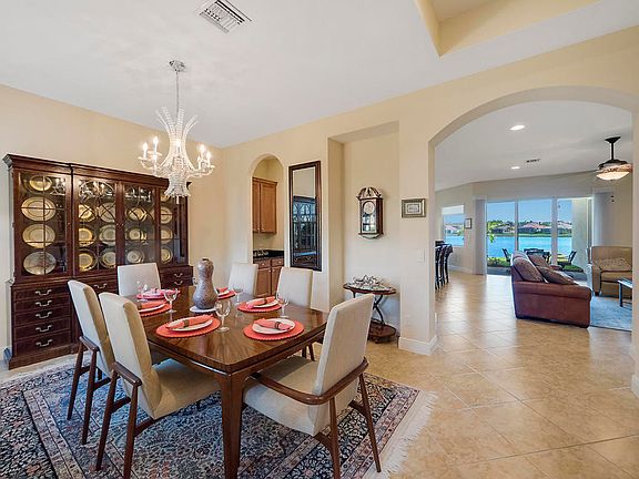 INCREDIBLE WATER VIEWS! This pristine, bright SINGLE STORY 3 bedroom, 2.5 baths, 2 car garage home has the most Magnificent water views from all living areas and master bedroom. The open floor plan of this Alandro model allows for inviting gathering spaces and privacy for guests with its split bedroom plan. The home features impact resistant windows and doors, tile throughout the main living areas, plantation shutters and Hunter Douglas sheer/shading window treatments, an open concept family room with lovely breakfast area overlooking the lake, and a large eat-in granite island in kitchen with all stainless steel appliances and wood cabinetry. A convenient butler's pantry separates the kitchen from the formal dining room. The master suite has his and her closets........