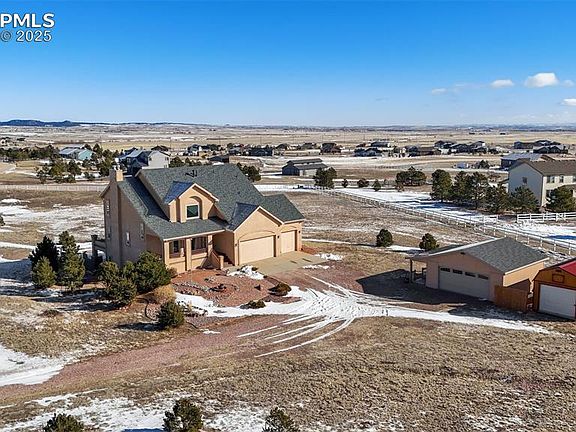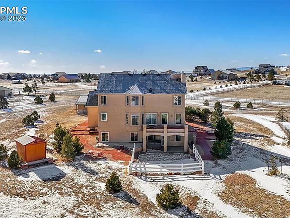 Nestled in the highly sought-after Latigo Trails equestrian neighborhood, this property is a horse lover's dream. With over 3+ acres of fully fenced land on a corner lot, you'll enjoy the perfect blend of rural tranquility and modern amenities. Latigo Trails offers riding easements throughout the community and access to a vibrant Equestrian Center for events and activities. This expansive 3400+ SF home features 4 bedrooms, 4 bathrooms, and an oversized 3-car attached garage. The interior boasts gorgeous hickory wood flooring on the main level, a spacious kitchen with granite counters and stainless steel appliances, a formal dining room, and a cozy living room with a gas fireplace. Upstairs, the primary suite is a private retreat with its own gas fireplace and an attached 5-piece bath, accompanied by another bedroom and full bath. The fully finished walkout basement adds even more living space, including a large family room with a third gas fireplace, two additional bedrooms, and a full bath. Outdoor amenities are equally impressive! The property includes a 12x24 shed with 2 storage lofts and a 24x24 agriculture building/detached garage with a concrete floor, ideal for a workshop/barn or storing toys. There’s also a 10x12 garden shed and a 30-amp RV outlet on this property. The beautifully landscaped yard features a fenced backyard, solar lighting, and plenty of room to relax or entertain. Additional highlights include a newer Class 4 (hail resistant) roof (2022) on the house and ag building, recently serviced furnace, and inspected septic system. With light-filled spaces, thoughtful storage, and modern updates, this property is ready to welcome you home to the Latigo Trails lifestyle!