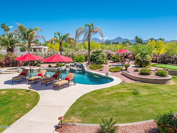 Welcome! Embrace breathtaking views of the McDowell Mountains near entire range from this quintessential Arizona home built in 2003 and updated in 2015. Designed with high ceilings, expansive sightlines, a great floor plan, premium finishes and amenities, this home will satisfy! Located in the desirable Cactus Corridor in a neighborhood without HOA restrictions, this property offers privacy and opportunity. Outdoor living is elevated with a pool, spa, putting green, and lush lawns. Additional features include a 378 SF detached air-conditioned cabana/office/storage with BBQ patio, 3-car garage, RV parking, and 3 gas fireplaces (one outdoor). The home is filled with natural light, showcasing 4 en suite bedrooms, an office plus 5th bath, and pristine conditions. Come see this paradise!