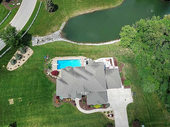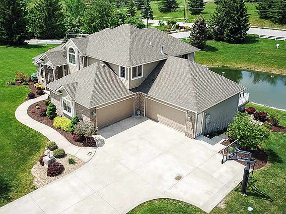 MOTIVATED SELLERS & OPEN HOUSE SUNDAY 7/8 from 1-3. Pool parties at their beautiful manor were the highlight of everyone's summer. After soda (for the kids) and mimosas (for the adults) in the home's open concept kitchen and sitting areas, everyone moved outdoors where the private lot offered beautiful views of rural suburbia and well-manicured landscaping. From there, they'd dip their toes in the in-ground saltwater pool, where the water temp was always set at a comfortable 79 degrees Fahrenheit. The pond was also available for outdoor fun, offering privacy to canoe, go fishing, and more. As evening approached, they'd dry off and enjoy an outdoor barbeque on the composite deck. Then, a quick cleanup before movies in the basement theatre, drinks at the wet bar, and billiards in the rec room. And with five bedrooms, everyone had a place to stay so that the festivities could continue the next day. It was the highlight of the summer, and they never let too many weeks pass before doing it all over again at the manor in southwest Fort Wayne. Home Details: 5,485 square feet; five bedrooms; four and a half bath; living room has coffered 13-foot ceiling; lighted stairways; wood or gas fireplace on main floor; open concept eat-in kitchen and seating area; kitchen has wood floors, Harlan cabinets, built-in microwave and convection oven, 6-burner stove, granite countertops and stainless steel appliances; master on main with ensuite bathroom (double-head walk-in shower) and tray ceilings in both; office with beautiful built-ins; walkout basement has its own kitchen with stainless steel appliances and convection microwave, gas fireplace; living room, recreational room, 5th bedroom, furnished theatre room, exercise room, and storage space; billiard table is negotiable; lower level TV remains with property; main and lower level sound system; walkout to composite deck; pond view with private access and access to 2 more via common area; stamped concrete patio surrounds in-ground saltwater pool (16'x38', 8' deep); pool has electric heater, deck jets, fiber optic lights, auto cover; heated four-car garage with hot/cold water hook-up and floor drains; laundry/mud room with lockers, alarm system and glass breakage alarm on windows; new commercial grade 75-gallon hot water heater; 2"x"6" framing; irrigation system with separate meter.
