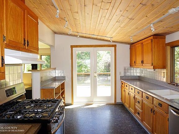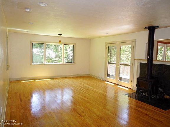 Sylvan setting for a sweet home, separate sauna structure, small storage barn, plus garage/workshop/loft (1100 sf, +/-). 1.35 level acres; sunny meadow surrounds garage; treed, fenced yard at house. Two bedrooms, one bath, + bath & outdoor shower at sauna. Large atrium entry lit by many windows, accented with painted wood plank ceiling; large laundry w/sink, door to deck. Tile hearth for ducted wood stove in living room. New kitchen appliances. Double glass doors to deck. Natural light from skylights, glass doors. Pine ceilings living room, kitchen. Wood floors living room, bedrooms. 900 sf deck overlooks fenced grounds (approx. 1 acre). Two-section garage w/tall doors, deep garage, work area on one side, standard door on other - still with some work room. Exterior stairs to pleasant, sunny loft. This is a nice package as is, with expansion potential. End-of-road privacy. ComCast says hi speed possible; buyer to verify.Radiant heat in atrium.