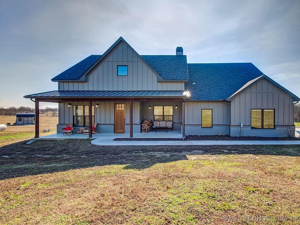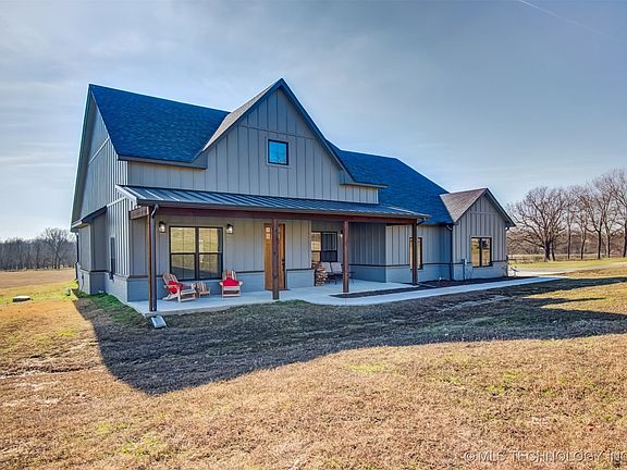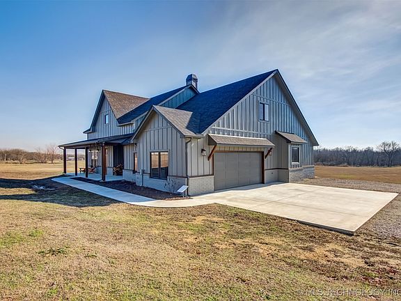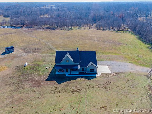 Welcome to privacy in the country but just minutes from town! 28+ acres total. This custom build in 2023 is tucked away sitting beautifully on a 7.5 acre land parcel with stocked pond & gorgeous views of the additional 20+ acre parcel of wooded land for your hunting/pasture or livestock needs with a second pond, deer feeders, deer stands, and trails. Off a private dead-end road with easy Highway 75 access just a few miles away. Beautiful farmhouse style exterior with newer shed. Open concept interior with tall vaulted ceilings, plush carpet in bedrooms, ceramic tile in other living spaces, quartzite & granite countertops. Kitchen boasts a large center island, window over sink with quaint open shelving, SS appliances, gas range, cozy wet bar & plenty of storage with a huge pantry! Pella windows and Pella sliding glass door leads to the large patio off the back porch with a wonderful view of the pond, tree line, and pasture. Large private primary suite with back patio access, spacious walk-in closet, dreamy spa bath with soaking tub, huge walk-in shower with bench & dual shower heads! Separate laundry with sink is right by the primary bedroom. 2 additional bedrooms on 1st floor & large 4th bedroom/gameroom/office over garage. 3 full baths down plus a convenient 1/2 bath off back porch! Convenient mud room off of garage, and tons of storage closets! Make it all yours! Move-in ready and in Skiatook schools.