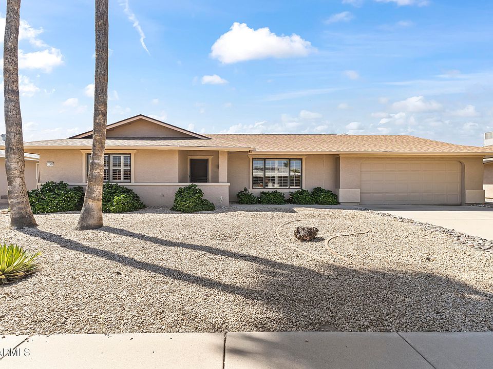 This CUTE home located in the 55+ Active Adult Community of Sun City West offers 1138 sf., 2 spacious Bedrooms, and the 2 Baths provide convenience for you and your guests. There's NEWER appliances in the Kitchen. The two-car Garage provides secure parking and storage, while the screened-in patio offers a private outdoor area for relaxation or entertainment. The pergola covered patio is perfect for your BBQ or smoker. The LARGE Utility Room has enough space for an office, hobbies, or crafts. North/South exposure is ideal for the AZ weather. The Stucco exterior adds to the curb appeal making this a GREAT property. Close to Shopping, several Rec Centers, Golf, Bowling, Pickleball and so much MORE! WELCOME HOME!