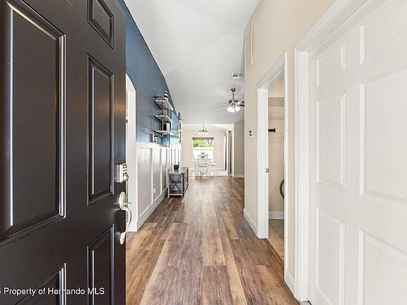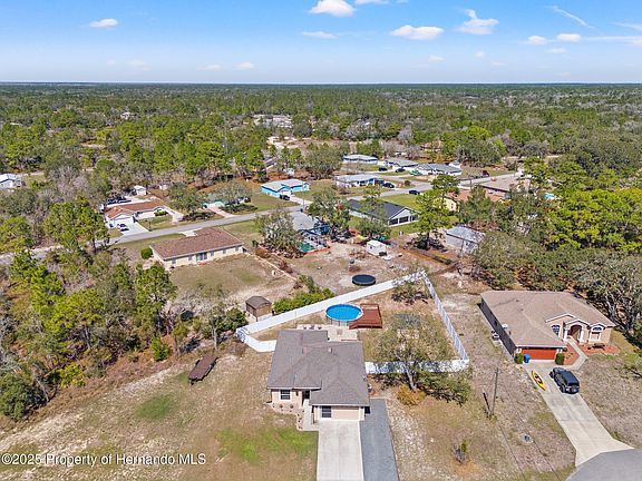 UNDER CONTRACT - ACCEPTING BACK UPS! Welcome to this ONE OWNER, 3 bedroom, 2 bath home, WITH a POOL AND fully fenced (2021) yard, on a gorgeous oversized lot, situated at the end of a cul-de-sac- for added privacy and quiet! Located in one of the most central & quiet neighborhoods in all of Hernando, the Royal Highlands. Driving up, be greeted with great curb appeal and smart features, like a video doorbell and cameras! Walking inside, you'll be lead into an inviting & oversized living space, showcasing the open concept, natural light & wainscoting! The entire interior of the home was just freshly repainted (2025). The living room has built-in shelving and high ceilings! Off the living space, is the dining room and kitchen, with great natural light, loads of cabinet space and wood cabinets! Off the dining space, are sliders that lead you to an inviting paver lanai area— this space is all you can ask for, to truly enjoy Florida outdoor living! There is a hot tub, with spa like features— like a waterfall and extra lighting, a fire pit, a large deck, leading you to the gorgeous pool— a perfect place to lay back, relax and enjoy the upcoming Spring and Summer weather! Out back, there is also an oversized shed (2020)— a great storage spot for all your yard materials and toys! Back inside, tucked away, on one side of the home, for ideal privacy, is the owners retreat has an attached ensuite bathroom and walk-in closet! On the opposite side of the house, excellent for additional peace, is both spare bedrooms, comfortably sized & w/ great closet space! The spare bathroom, sits in between these rooms & features a shower/tub combo! There is also a large laundry room. Other great features? The home was built in 2018, so newer AC, roof, hot water heater and electric panel! The garage is also screened in, so you are able to make the most use of this space! Moments away from all Hernando County has to offer— like shopping, eateries, hospitals & activities, this property will not last long! Call today for your private showing! USDA Eligible! 0% DOWN!!