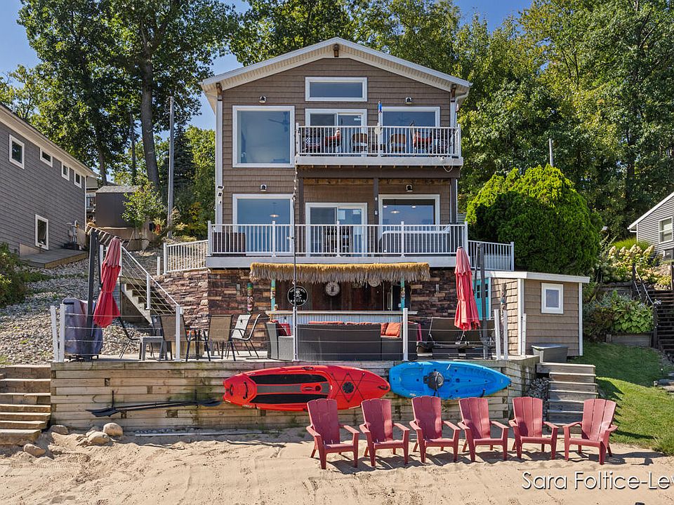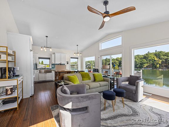 Welcome to Big Pine Island Lake! This beautiful home is located on the west side of the 223-acre spring fed, all sports lake. Offering just over 1,700 square feet of finished living area, this 2017 built home features lake and sunset views year round! With an open floor plan and a dream kitchen, there is plenty of room to entertain in the summer, winter and holidays. The main level features include the primary bedroom with private en-suite, living room area with fireplace, kitchen with a large island and a walkout to the upper deck. A few steps to the lower level and you will find an additional two bedrooms, full bathroom, and a fabulous rec room and wet bar area for entertaining guests. With an upper and lower deck, you have expansive lake views and your very own hot tub for those chill winter nights. This home has a full house generator and a shed for extra storage.