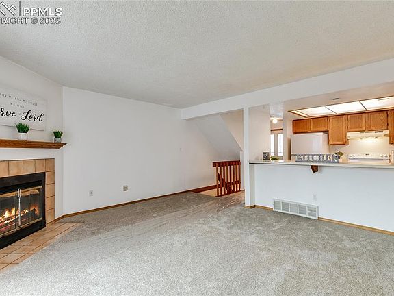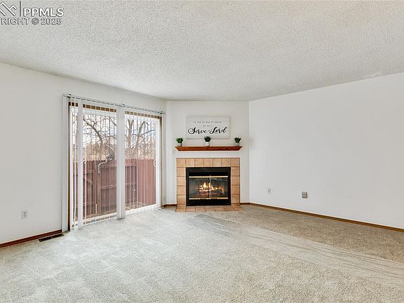 Very well kept 2 story condo with 1 car attached garage! Brand new carpet throughout! Newer furnace and hot water heater. Great location near Ft Carson and Peterson AFB! Wide open basement has new carpet and can be used as 3rd bedroom or secondary living room! Main level has kitchen and open living room with wood burning fireplace and walks out to enclosed patio backing up to green space. Upper level has 2 bedrooms one with mountain views and the other with views of the open space and creek! Upper level also has full bathroom! Well located within the community with directly across from guest parking lot. Convenient location next to Safeway strip mall and Fountain Blvd with easy connection to Powers Blvd and I-25 and Colorado Springs Airport.