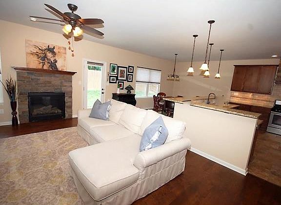 Better than new 3 years young is loaded w/upgrades. Ranch style home w/open floor plan,9 ft ceilings,vaults,Hardwood & Ceramic Floors,3 beds,2 baths, MF laundry & so much more. Great Room is spacious & boasts gas fireplace. Kitchen has pizzazz ! 42" walnut stained cabinetry,granite counter tops &brfst bar,pantry, gas oven/range,stainless appliances,decorator back-splash & stone accented exhaust hood.Brfst/Dining area is spacious with easy access to patio.Master Suite has large walk-in closet,vaulted ceiling with master bath that is sure to please.Double sinks,separated water closet,2 person shower with 2 shower heads & surrounded with decorative tile.Additional 2 bedrooms are nicely sized w/ample closet space.Freshened landscaping, patio & wood privacy fencing makes this a "must see house". LL is ready for buyer finish w/rough in for bath.Relocation listing & can''t accept offers contingent upon sale of buyers house.NO Showings till Mon, June 20 at 4PM & 2 hrs notice for showings.
