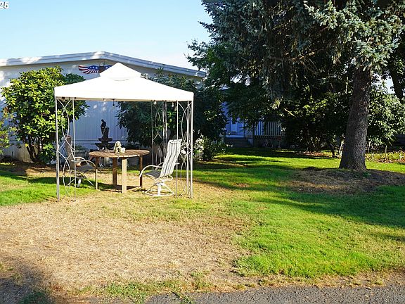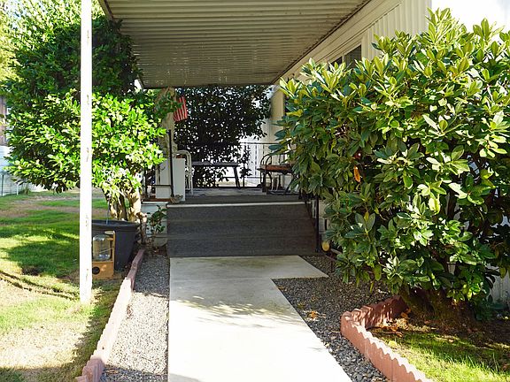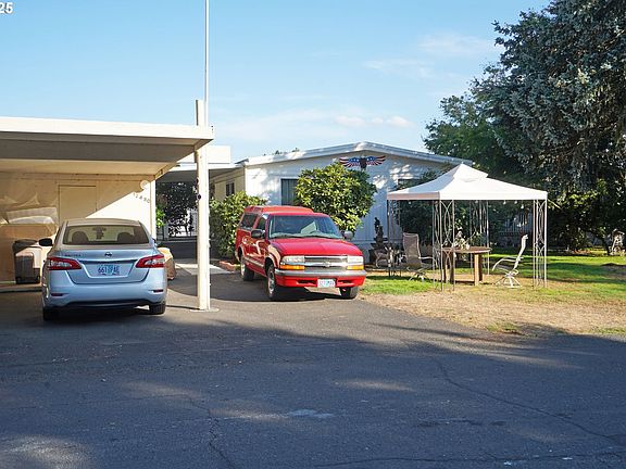 Beautiful, updated move in ready home with 2 large bedrooms and remodeled bathroom. Recently sealed roof. Updated double-paned windows. Central air conditioning. Fresh concrete walkway installed last year. Relaxing covered deck. Huge front and back yard. Lots of space between homes means more privacy. Mowing of the lawn is included in the space rent. Spacious living room with luxury vinyl plank flooring, painted walls and vinyl windows. Dining room has vinyl flooring and built-in hutch. Large kitchen with attached utility room. Washer, dryer, refrigerator and range all stay. Large primary bedroom with huge walk-in closet. Good sized 2nd bedroom. This park is very different than most parks. Approx 7,000 sq ft yard, river front walking paths, gym, swimming pools, recreation facilities, security and more! Enjoy the Columbia River lifestyle.