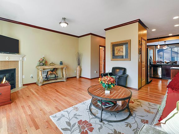 Location, Elegance & Serenity! 3 bed, 2.5 bath w over sized heated & finished garage. Soaring ceilings, crown molding & real hardwood floors set this home apart. Kitchen w granite, breakfast bar, pantry & stainless. The living room area features gas fireplace & deck overlooking private yard & protected green-space. Master w on-suite. Yard w garden space, berries, fruit trees & flowers. Don't miss the covered hot tub & garden shed. Energy efficient hydronic heating & tankless H2O. Very low dues.