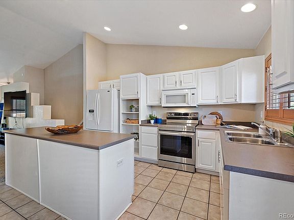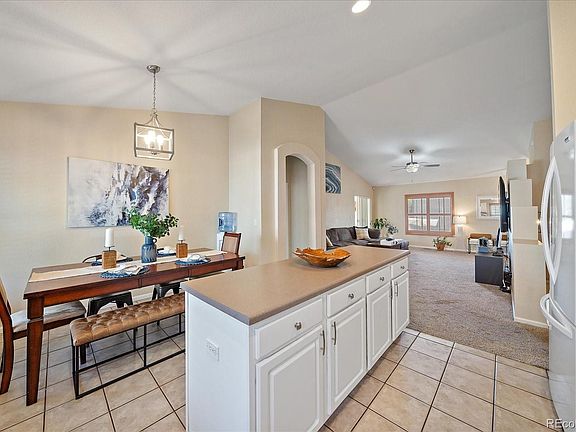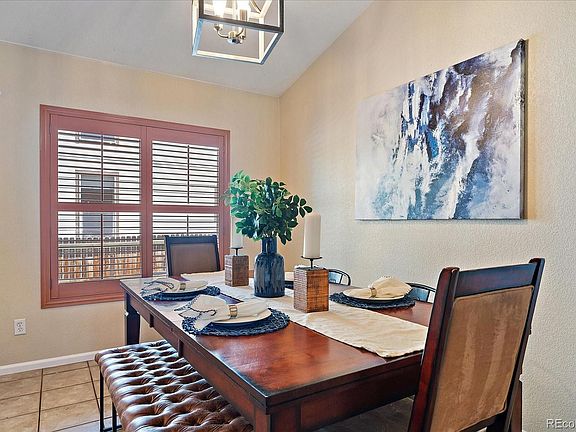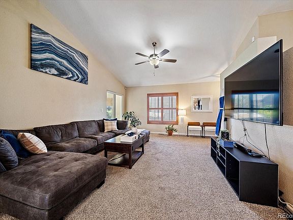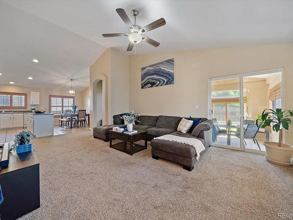 This adorable move-in ready ranch style home features an open concept and extra living space to enjoy in the 12x10 sunroom. The large primary bedroom with vaulted ceiling has an en suite 5 piece bathroom and walk-in closet. Spacious kitchen with island also has a designated eating area so that you can host larger gatherings if you desire. Kitchen and eating area are open to the generously sized living room. Two additional bedrooms, one with a walk-in closet, a full hall bathroom, and laundry room complete the main level. Expansive vaulted ceilings and charming plantain shutters throughout the home. The unfinished basement is insulated and has over 1,000 square feet for you to customize with 4 egress windows already installed and is plumbed/stubbed for bathroom. Central A/C, new water heater (2024), newer stove (2021), newer carpet/pad (2021). Fenced yard with sprinkler system installed, raised garden bed, and back patio for outdoor entertaining. Walk half a block in either direction to access the huge neighborhood park, or the Branton Gulch trail and open space, or the neighborhood pool. Conveniently located close to schools and stores/restaurants.