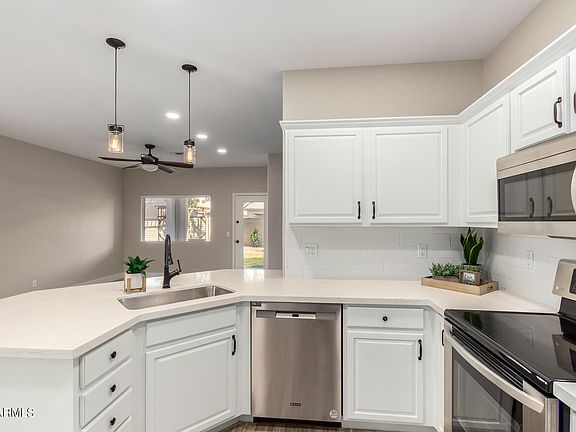 Beautifully Updated & Move-In Ready!!! New interior/exterior paint, flooring, baseboards, upgraded kitchen, bathrooms and more!! Come inside to discover spacious living areas with designer palette throughout, wood-look tile flooring, and arched doorways. The fabulous kitchen is ready for you to cook delicious recipes offering quartz counters, plenty of white cabinets with crown molding, recessed & pendant lighting, a pantry, sparkling SS appliances, stylish tile backsplash, and a peninsula with a breakfast bar. Primary bedroom features soft carpet in all the right places, a private bathroom, & an ample closet. Sit back & relax in the wonderful backyard with covered patio, swaying trees, & endless blue skies! What are you waiting for? *Seller May Carry!*