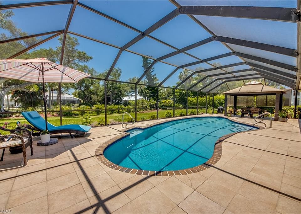 Welcome to your dream home in the heart of South Fort Myers! This beautifully renovated 3 bedroom, 3 bath residence is a perfect blend of modern luxury and classic charm. From the moment you step inside, you'll be captivated by the exquisite details and high-end finishes throughout. Enjoy the warmth and character of wood plank cathedral ceilings and wood burning fireplace. Luxury vinyl flooring by Wright Flooring adorn the main living areas with new baseboards creating an inviting and cohesive space perfect for both relaxing and entertaining. The heart of this home is the completely remodeled kitchen, featuring stunning quartz countertops and stylish backsplash and a smart TV. Newer appliances, including a double wall oven, make cooking a pleasure. Custom floating shelves add a touch of elegance and practicality to the coffee bar area, dry bar area and laundry room. Two additional bedrooms provide plenty of space for family or guests. One en suite bedroom offers a pool bath for guests. Step outside to your backyard oasis with a private pool, perfect for cooling off on warm Florida days. Newly screened lanai includes a pagoda with a ceiling fan and lights which is perfect to entertain friends and family under. The landscaped yard provides a serene backdrop for outdoor living. New hurricane manual shutters. Roof and A/C is from 2018. New Electrical panel/breakers.Located in the desirable McGregor Woods, you are just minutes away from shopping, dining, and beautiful Gulf Coast beaches of Sanibel and Fort Myers Beach. Don't miss the opportunity to make this exceptional property your new home. Schedule a showing today and experience the perfect blend of luxury and comfort in this South Fort Myers gem!