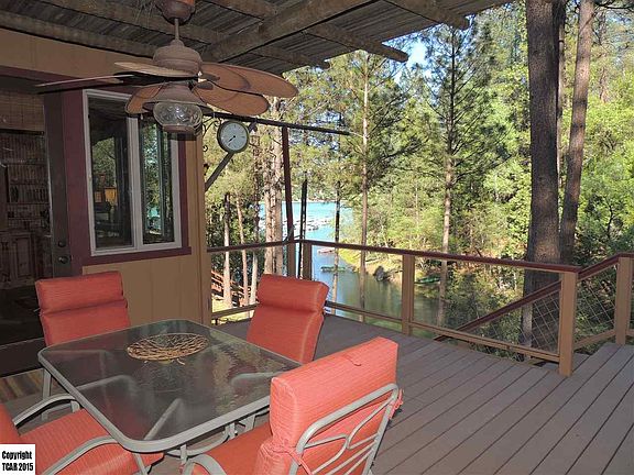 Prepare to be amazed w/ this exceptionally large/spacious, over 4,000 sf rustic cabin style, one of a kind home w/boat dock on Pine Mountain Lake next to marina. 10 yrs new, this is one of the best bargains on the lake! Make life long memories w/family & friends right here! 4 large Bdrms w/ the largest closets you'll see in every room, 2 1/2 Ba., Grand entry FamRm w/blt in bar & refrigerator; windows up 60 ft high providing amazing views, open beam knotty wood ceilings, skylights, ceiling fans, tile flooring, propane heat stove, central vac, 3 Guest Bdrms (one w/wet bar, refrigerator & courtyard. 2 w/bathroom access), ceiling fans in all rooms. Main living level has Grand Master Suite that features lake view, propane heat stove, deck access, 2 huge closets, knotty wood vaulted ceiling, bedside lamp switches, cozy carpeting, dual vanity sinks. The staircase and railing are rustic peeled wood design & adorn both upper & lower levels and Great Rm/living area. Real logs also frame your large custom built kitchen, custom cabinetry & butcher block island w/prep sink, blt-in knife block, storage shelves; pantry, blt-in dish racks, farmhouse sink, stained glass drop & recessed lighting, cabinet matching appliance finishes, gas cooktop, granite counters, breakfast nook & sink/counter w/lake views. Lvrm has River Rock gas Fireplace & mantel, rustic lighting, bright windows overlooking covered patio w/ misters, fan & light, built in BBQ area w/burner. Wall sconce lighting & old world wall texture throughout. Beautiful engineered wood flooring in kitchen, FmRm & half ba. Also 3 Bonus Rms, including wine cellar/tasting room, shop or hobby room, & lrg room under deck exterior entrance for extra sleeping, workout, game room or office area, study or studio. Large oversized 2 car garage w/ wood door, ex-prkg, plenty of under house storage, Trex & wood decking, cement front walkway, wood & stone exterior, lots of exterior lighting, drip system, ex-storage at dock, so many great features, you must see if in the market for an extraordinary lake home.
