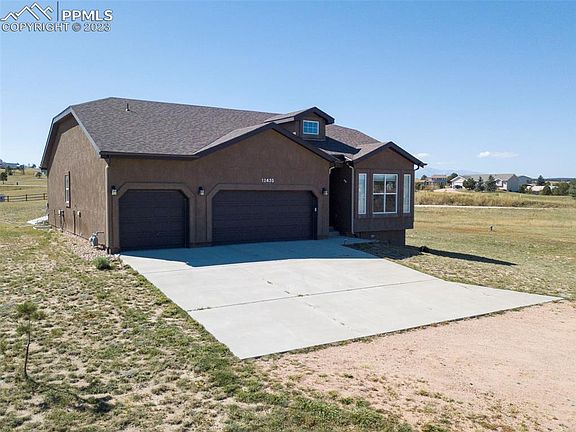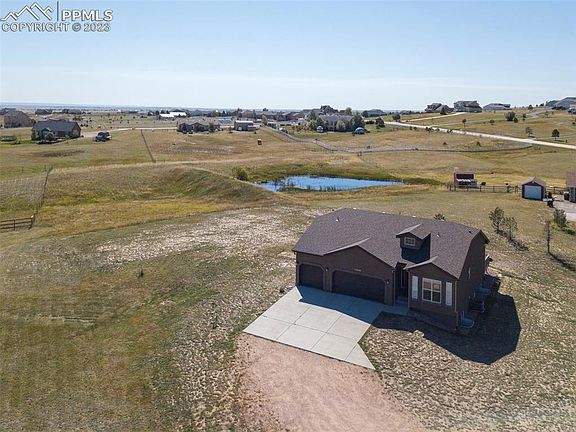 Welcome to this beautifully crafted 2016 ranch-style home! Upon entering, you'll notice the hardwood floors that grace the entire main living area, offering an abundance of natural light and a canvas for you to customize as your own. The main level boasts a front-facing bedroom with an adjacent full bathroom. As you continue down the hall, you'll find the kitchen, seamlessly integrated with the open living room and flowing into the master bedroom. The kitchen is a chef's delight, featuring granite countertops, a convenient counter bar, a pantry, and ample storage. Step out from the kitchen onto the inviting wooden deck, perfect for evenings and gatherings. The living room is adorned with a cozy gas fireplace, setting a warm and inviting ambiance. The master suite is a true sanctuary, showcasing a luxurious five-piece bathroom complete with a soothing soaking tub, a standing shower, and double sinks. A generously sized walk-in closet provides abundant storage space. The lower level offers a large living room and two additional bedrooms, along with a 2 full bathrooms and more storage space! Situated on a sprawling 2.8-acre property, this home is an ideal for horses or your furry friends alike. A private pond adds a touch of serenity, attracting ducks to the tranquil setting. With no Homeowners Association, you have the freedom to make this property truly your own. Plus, enjoy the picturesque view of Pikes Peak, providing a stunning backdrop to this inviting home.