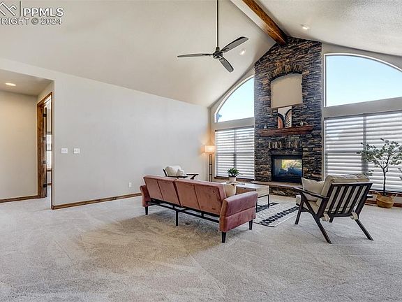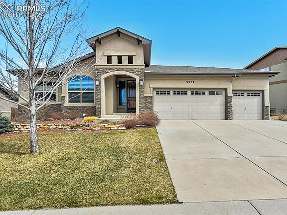 Prepare to be impressed! This Ranch Style home is a work of craftmanship in the highly sought after Stone Crossing at Middle Creek community. As you enter the home you will notice the custom indoor/outdoor fireplace, natural light, high ceilings, and solid flooring which has been recently extended and restored. The foyer is spacious and leads into a living area connected to an eat-in kitchen with granite breakfast bar. The kitchen is truly a chef's delight with a large surface area of counter tops, all Brand-New Appliances (gas cooktop, 2 ovens, microwave, dishwasher, and refrigerator), and a pantry! The Primary Suite is a true retreat with an attached ensuite for a spa like feel and walk-in closet. There is also a 2nd Primary suite with attached full bathroom and walk-in closet. Additionally on the main level you will find a dedicated office space, guest bathroom, extra closets, and a laundry room with utility sink. Moving to the newly finished basement (2019) with a custom designed bar which is perfect for entertaining guests or hosting extended family. The kitchen/bar includes dishwasher, beverage refrigerator, microwave, and icemaker. The spacious family room includes a lovely gas fireplace as well as an included high-end surround sound/theater system. There are 3 additional bedrooms in the basement, two of which have connected full bathrooms. This area would be perfect for multigenerational living. Additional extras in this home is an exterior electric fence, video-type doorbell, radon mitigation system, new appliances, sprinkler/irrigation system, extended patio, 3-car garage, and LOCATION! Enjoy walking trails, parks, views of the mountains, easy access to shopping, restaurants, schools, medical care, USAF, Monument, and more! This home is top-notch and move-in ready!