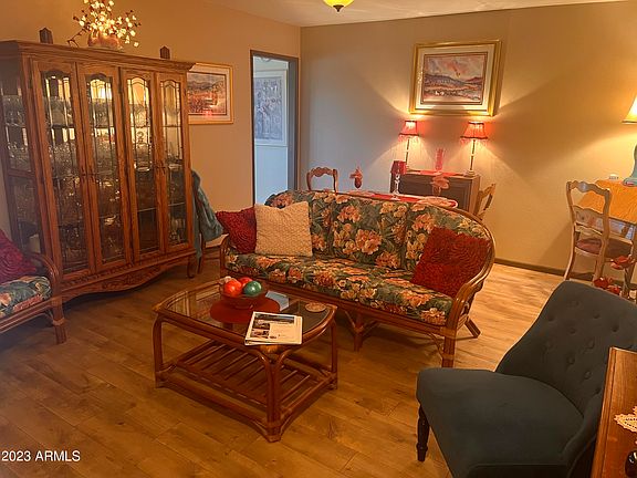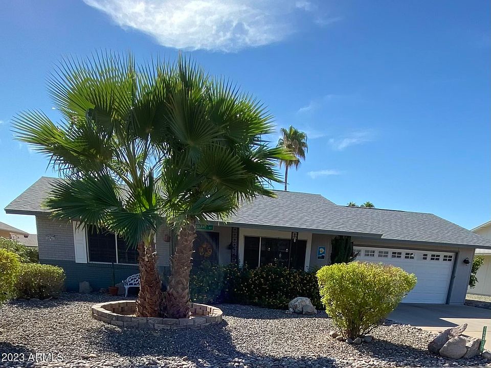 This home is a spectacular Gem! Tropical private front porch awaits you in Sun City West. The Laminate flooring throughout the home makes the home even more spacious. Walk into the updated kitchen to find tile floor and marble quartz countertops and relax in your comfy Az room. The main bathroom has been nicely updated with a new vanity. There is also a half bath in the garage's laundry room that has a toilet and a large laundry sink. This 2 car garage with all the updates and a NEW 2022 HVAC SYSTEM with a 10 year warranty! NEW WATER HEATER 2023 just installed. A NEW SINGLE LAYER ROOF 2015. Also a quiet backyard that is big enough for a pool and entertainment. This home is Priceless!