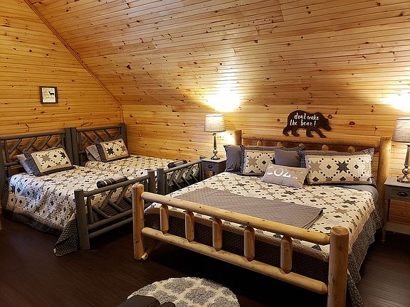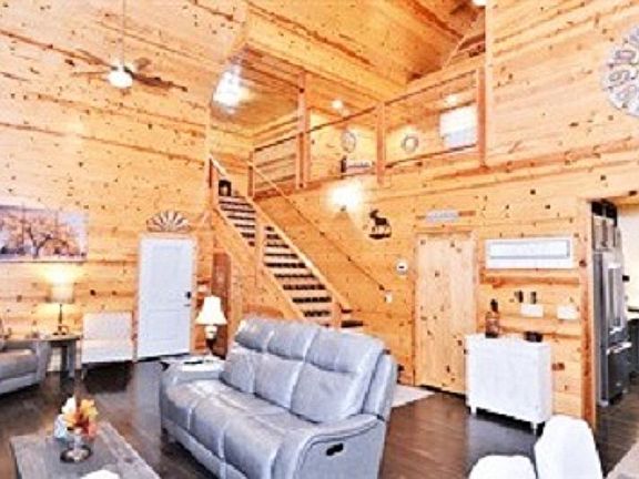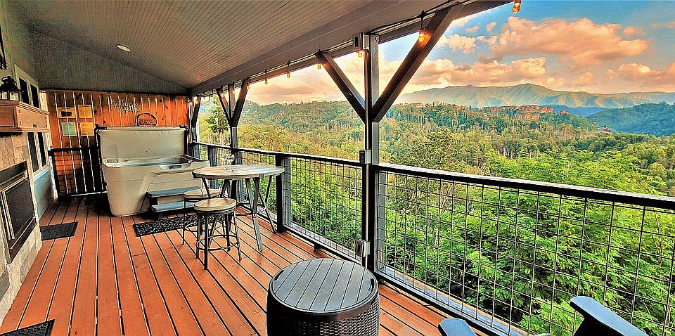 New construction, county building/planning approved for 2 BR 2B, paved gated driveway. New construction, downstairs, has coat closet at front door, large master bedroom with king sized bed, master bath with glassed in tiled shower and his/hers sinks with granite counters tops and backsplash, master closet, laundry room, and 25' high vaulted den and dining area, large Kitchen, new kitchenmaid appliances with gas convection stove, built-in convection microwave, lots of cabinets and quartz countertops with butcher block island. 300 sq ft deck and indoor/outdoor gas fireplace stone on both sides with mantles. TV over inside mantel, Upstairs has storage room, large full bath with granite counter tops and backsplash, tub/shower all tiled, loft area has two sleeping areas and couch, large 500 sq ft bunk room with large TV rec area, electric fireplace and internet connection, sleeps 6 to 7. Ceiling fans in all rooms and two on deck. On demand hot water heater, new high efficiency duel HVAC with lifetime warranty by Amana. Home comes furnished with high end new leather couches and dining table and side tables and beds in all rooms. One car airport and lots of outside level parking. Fire, bug proof low maintenance Hardi-plank exterior with foam insulation. Beautiful sought after views of Great Smokey mountains and MT. LeConte, great location lot backs up to Park property, off the Spur between Gatlinburg and Pigeon Forge (minutes from either). 334-462-5412