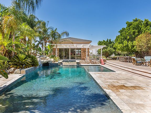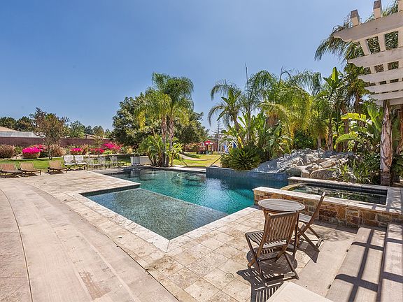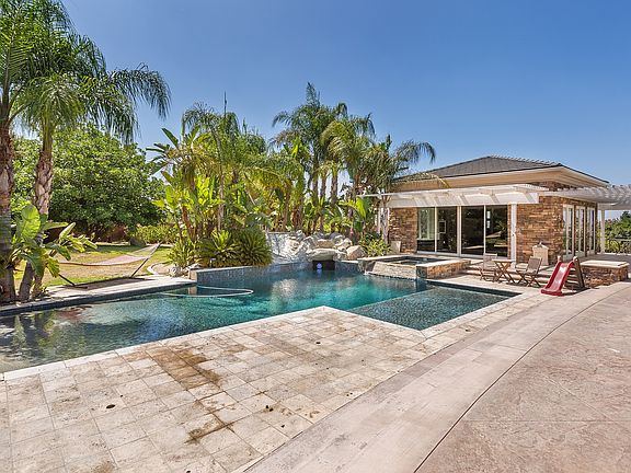 Spectacular single story, custom built home in prestigious Hillcrest neighborhood on 1.2 acres of land. Main house measuring approximately 5520 SF with 6 bedrooms 5 1/2 Baths & pool house of 600 SF of entertainment space with 3/4 bath. Each room shows the attention to detail that makes this home truly one of a kind, from the arched door ways, trey ceilings with can lights, generous crown molding, travertine and marble floors, wood floors, and beautiful custom built-in cabinetry in every room. Living & dining room have built in cabinets, wet bar, fireplace, trey & coffered ceilings, & two sets of French doors opening to the back patio. Kitchen & attached eating area is spacious with travertine counters, huge granite island with seating, & walk in pantry. Gourmet appliances include Sub Zero refrigerator, Full Size monogram freezer, Thermador 5 burner convection cook top, and Wolf double oven. The homes theatre room has a 4K projector, 108" Stewart movie screen, built in speakers, excellent acoustics and authentic sliding velvet curtains. Resort like back yard includes pebble tech saltwater pool with beach entry, large reef step, slide & underwater cave, built in BBQ with frig, large fire pit. A separate driveway provides inconspicuous RV storage space.