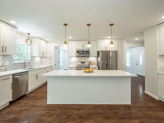 countertops, fixtures, and stainless-steel appliances. The upper level includes a large