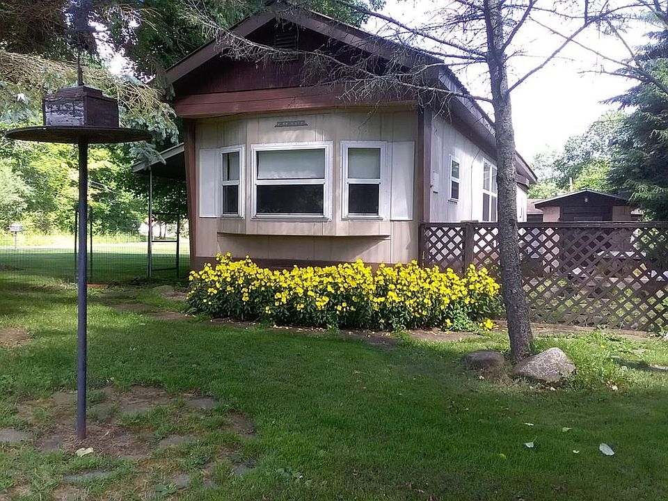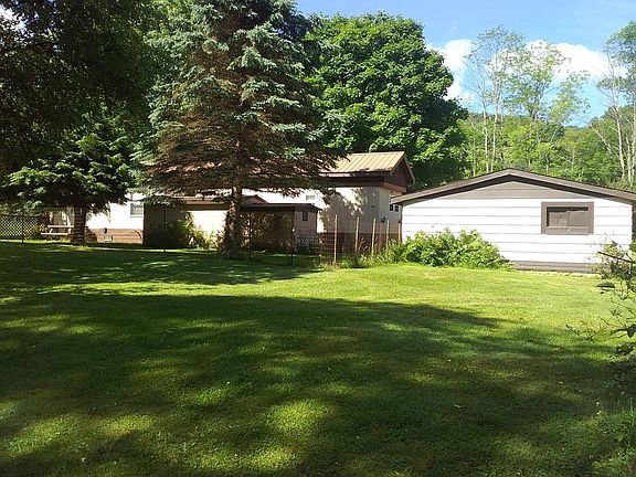 Older remodeled mobile home that offers a 1 or 2 bedrooms, nice size living room and kitchen with lots of cupboards, 1 bathroom with double sink, on 1 acre of land & a one car detached garage with a work shop, well house & storage shed on a quiet street out of town. The home has new windows & new roof, with a nice fishing stream in the back yard stocked with trout, out back also is a nice shaded back yard with patio deck & fire pit with a table to watch the wildlife that come to eat the berries and the apples. Also this property has a fenced in yard for a dog. A must see nice piece of property. Located on a 4 wheeler approved road.