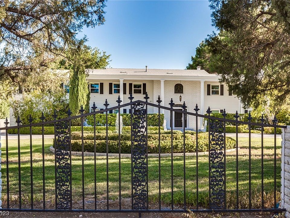 Step into a palatial compound that beautifully blends Vintage Vegas charm with modern elegance. Situated on nearly an acre, this estate has been remodeled to perfection. A grand entrance welcomes you to a formal/entertainment room with a fireplace and hardwood floors, leading to an intimate veranda overlooking the gardens. The Family Room boasts custom built-ins and a fireplace, while the gourmet kitchen dazzles with stainless steel appliances, an eat-up island and a walk-in pantry. The upstairs is sure to impress with 3 bedrooms and a primary suite with dual bathrooms, walk-in closets and a sitting area. The manicured “Versailles” lawn surrounds a heated saltwater pool, complemented by statues and water features. An additional second home/casita on the property features a fully remodeled two-bedroom residence complete with a kitchen and family room. With a detached two-car garage and ample additional parking space, this 6365 square feet estate is a Las Vegas Masterpiece.