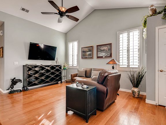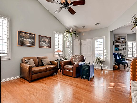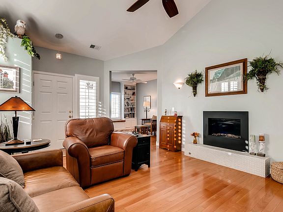 Beautiful, corner lot ranch home with 2 bedrooms, 2 baths & office/study with elegant built-ins! Murphy Creek 18 hole golf course, pool, tennis courts & clubhouse make for an amazing community! Easy access to DIA, Buckley Air Force Base, E470 & Southlands Mall. Stunning wood floors, stylish plantation shutters and ceiling fans throughout! Light and bright living room has vaulted ceiling & cozy fireplace. Spacious eat-in kitchen features slab granite counters, stainless appliances & access to pergola covered Trex deck and inviting back yard. Master suite has walk-in closet, double sink & decorative barn-style sliding door! Tastefully designed 3/4 bath with marble tile floor, laundry room & nice sized bedroom round out contemporary interior. Fenced yard with sprinkler system and zeriscape is perfect for Colorado outdoor entertaining. 2 car garage with full bank of built-in cabinets. Richmond home includes their signature concrete tile roof & brick exterior and covered front porch.